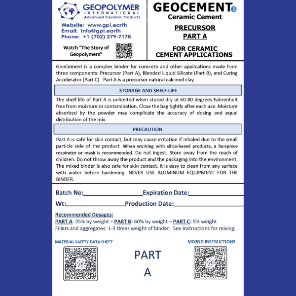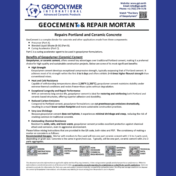 GeoCement is an advanced geopolymer binder that replaces Portland cement with a low-carbon, mineral-based system. It forms a dense, ceramic-like matrix with exceptional strength, fire resistance, and chemical durability—ideal for sustainable concrete, 3D printing, and high-performance construction.