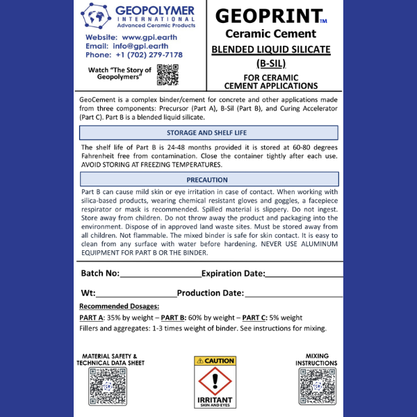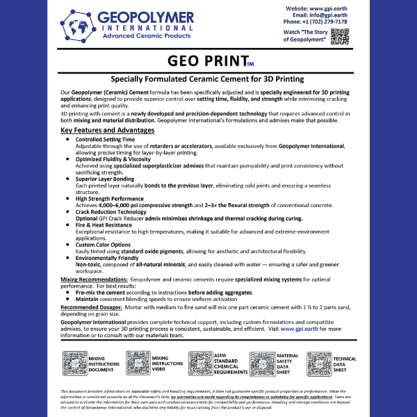 GeoCement Specially formulated Silicate for 3D printing. 3D printing with cement is a newly developed and precision-dependent technology that requires advanced control in both mixing and material distribution. Geopolymer International’s formulations and admixes make that possible.
